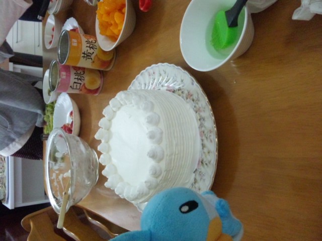 スポンジにクリームを塗って行き、クリームをホイップしたら私が側面に模様が欲しくなり一人フォークで側面を傷付け始めました。