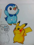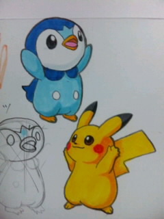 飛び出すイラストも画用紙ではなく厚めの白いケント紙を使用。紙にポッチャマとピカチュウを描き、コピックで色を塗り、折り曲げないようハサミでくり抜きました。